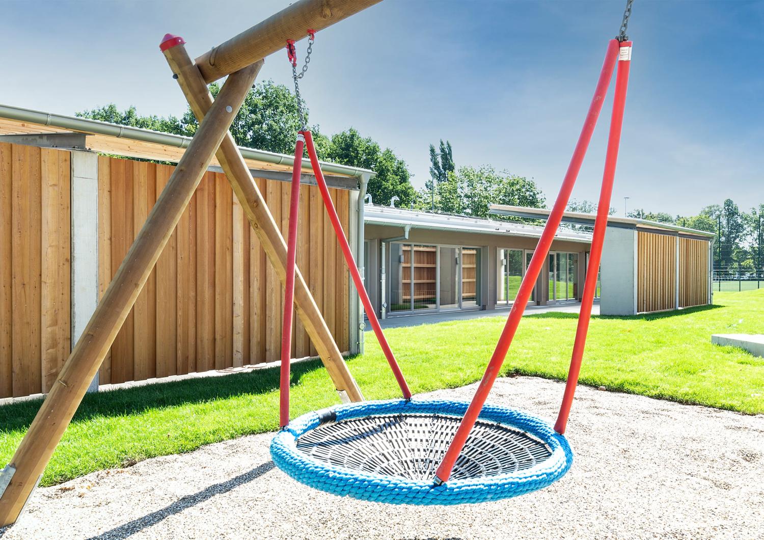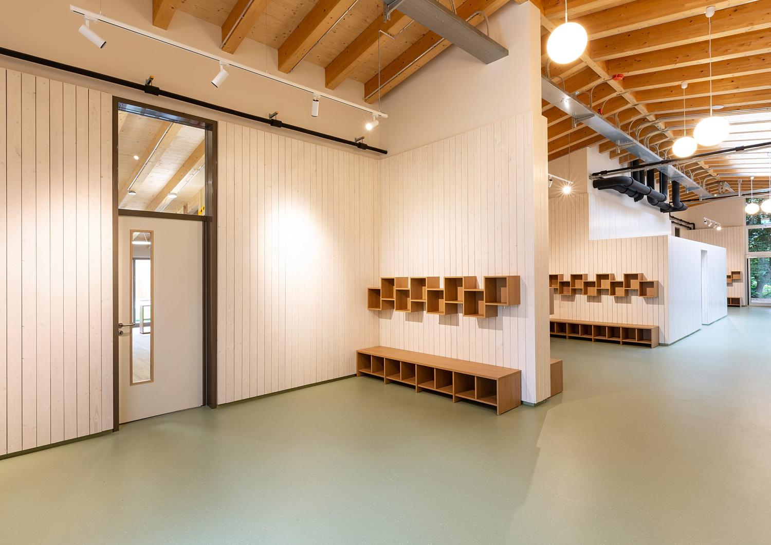 Auf einen ehemaligen Sportplatz, einem Gelände mit großzügiger Wiese und angrenzendem Baumbestand entstand ein schlichter erdgeschossiger Bau für 80 Kinder. Nutzer ist der ASC Göttingen 1846 e.V., Bauherr die Volksheimstätte eG. Unter der innen holzsichtigen Satteldachkonstruktion sind alle Installationen bewusst offen geführt. Ein großzügiger Flur teilt das Gebäude in Gruppen- und Räume für die Kinder und auf der anderen Seite solche für die Mitarbeiter. Weitgehend natürliche Materialien und zurückhaltende Farben bieten den Kindern Raum, sich selbst einzubringen.