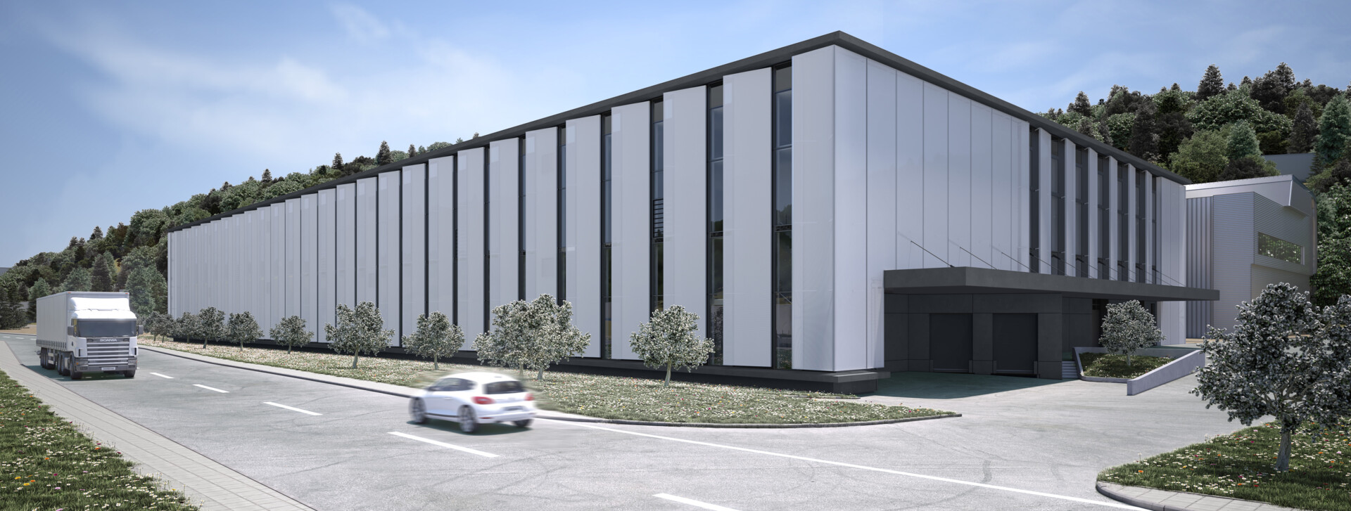 Ergänzt wird die Produktionsfläche durch zeitgemäße Büroarbeitsplätze, Sozialbereiche und leistungsfähige Logistikflächen für Anlieferung und Entsorgung. Damit vereint das Gebäude funktionale Effizienz mit klar strukturierten Arbeits- und Prozessabläufen.
