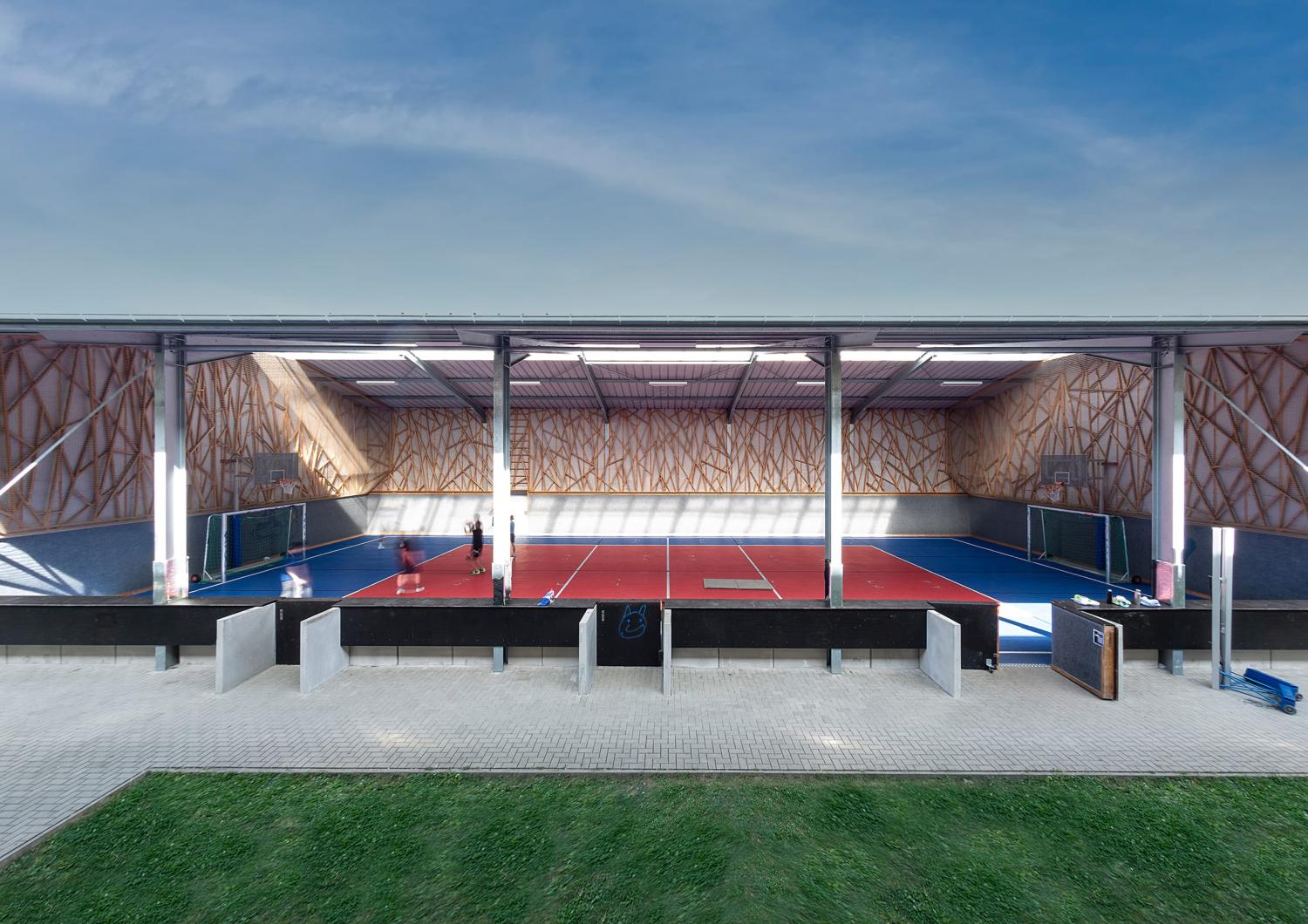 Based on a prefab hall module, this sports hall – open to one side – was constructed for refugees at the “Zietenterrassen” location. Some aesthetic improvements were made, if on a tight budget; a case in point is the structure with an inner cladding made of rough-cut wooden slats which hold the sound insulating mineral wool panels in place.